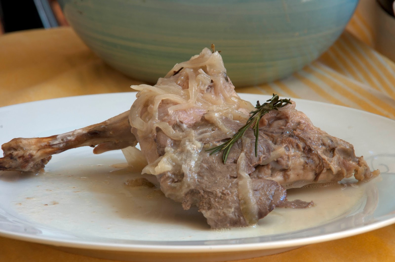 Cuando ya este transparente la cebolla, salpimentamos el conejo y lo ponemos en la fuente de la cebolla, junto con el caldo de pollo,el romero,el moscatel. Lo tapamos y volvemos a meter en el microondas 20 minutos a máxima potencia más o menos, ya depende de la carne del conejo.
